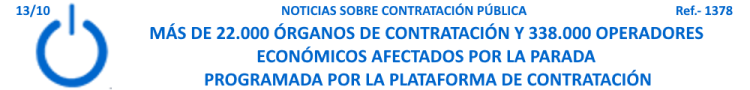 1378.- 13/10/25.- MÁS DE 22.000 ÓRGANOS DE CONTRATACIÓN Y 338.000 OPERADORES ECONÓMICOS AFECTADOS POR LA PARADA PROGRAMADA POR LA PLATAFORMA DE CONTRATACIÓN. El próximo jueves 16 de octubre está planificada una parada programada de ocho horas en la Plataforma de Contratación del Sector Público (PLACSP) en horario de 07:00 a 15:00 horas. En este intervalo de tiempo no se ofrecerá servicio, por lo que desde la Dirección General de Del Patrimonio del Estado, organismo del Ministerio de Hacienda responsable de la PLACSP recomienda a los órganos de asistencia, órganos de contratación, operadores económicos y usuarios en general que tengan en cuenta esta intervención en sus planificaciones. El objeto de esta parada es… Continuar leyendo y acceder a la nota de prensa.