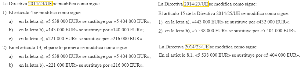 1380.- 27/10/25.- PUBLICADOS EN EL DOUE LOS NUEVOS UMBRALES DE APLICACIÓN EN MATERIA DE PROCEDIMIENTOS DE ADJUDICACIÓN DE CONTRATOS. El 23 de octubre de 2025 se ha publicado en el Diario Oficial de la Unión Europea (DOUE) la modificación de los límites cuantitativos en los procedimientos de contratación pública con vigencia desde el 1 de enero de 2026. Se han publicado así, el Reglamento Delegado (RD) 2025/2152, que modifica la Directiva 2014/24, el RD 2025/2150, que modifica la Directiva 2014/25/UE, y RD 2025/2151, que modifica la Directiva 2014/23/UE, todas estas modificaciones en lo referente a los límites cuantitativos aplicables a los procedimientos de contratación pública, entrando en vigor a partir de la fecha establecida en cada Estado miembro.